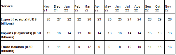 Service exports for the month of November 2022 are estimated at USD 26.23 billion and imports at USD 13.44 billion showing surplus of USD 12.79 billion. Overall trade balance for November 2022 is estimated at (-) USD 11.11 billion as compared to the (-) USD 13.19 billion in November 2021. Trend in services exports remain intact with a consistent growth trajectory. On the supply side, the gross GST revenue collected in the month of November 2022 is ? 1,45,867 crore is 11% higher than the GST revenues collected in the same month last year. Policy environment in the country remains attractive as the sequential growth of SENSEX (average of daily close) has shown M-o-M growth of 5.0 percent in November 2022 as compared to its corresponding value in October 2022.